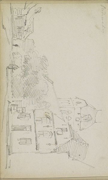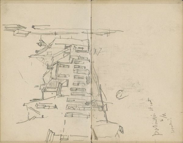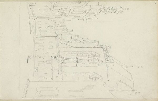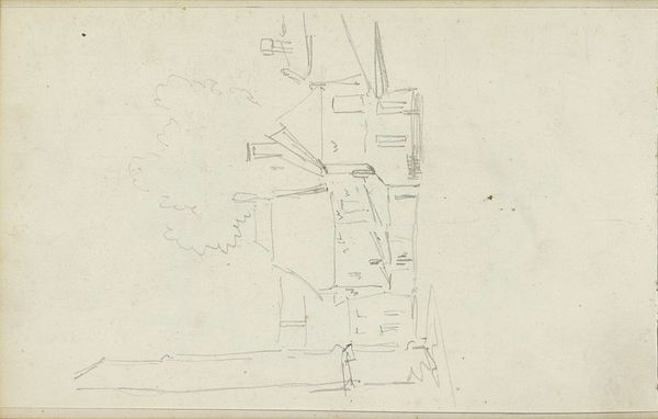 Adrianus Eversen made this drawing, titled 'Gezicht op gebouwen', using graphite on paper. Eversen has captured a snapshot of urban architecture. The choice of graphite as a medium is critical here; it's immediate, versatile, and economical, reflecting the rapid urbanization of the 19th century. The sketch is suggestive of the provisional nature of construction and progress. Notice how the graphite lines vary in weight and density, creating a sense of depth. The roughness of the paper also contributes to the overall mood, enhancing the sense of immediacy. Eversen employed the medium and its inherent qualities to create this evocative portrayal, emphasizing the relationship between material, process, and the industrial age. It’s important to consider how the artist's choice of materials contributes to our understanding of the social and cultural context of the work. This sheds light on how art and craft intertwine in our understanding of art history.