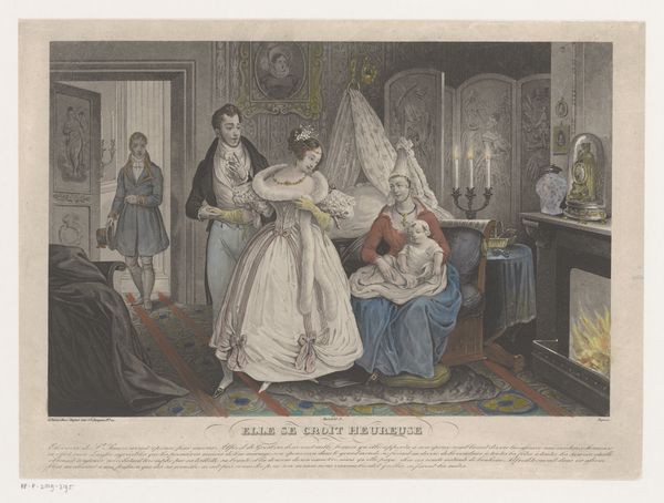 Curator: Here we have Andreas Geiger's "Dames en heren aanschouwen schilderijen bij een tentoonstelling in Wenen," created sometime between 1829 and 1848. The medium appears to be a combination of watercolor, lithograph, and possibly some drawing techniques on paper. It is currently an image only. Editor: It's teeming with activity and curiosity. There's a certain frenetic energy communicated by the multitude of figures, each engaged in their own contemplation of the art. The print hints at an almost factory-like reproduction due to its line work; one senses both artistry and commerce are deeply entwined. Curator: Indeed. Note how Geiger uses linear perspective and placement to emphasize the hierarchical relationship between the viewers and the art. The formal composition leads your eye across the room. Focus on the symmetry and frame of the pieces exhibited—this structure emphasizes an elevated viewing experience. Semiotically, each artwork shown within contributes to the construction of the scene as a signifier of culture. Editor: But the very act of observing these paintings underscores questions of class and consumption, wouldn't you agree? It brings up the material aspects. Who is allowed to see, to appreciate, to buy? Look at the clothes, at the slight distinctions which must be a marker of social position, all shaped by production methods. Are the artworks rendered as valuable, inaccessible objects? Curator: It would seem Geiger is indeed creating a narrative about art and spectatorship, framed within the stylistic conventions of Romanticism. I'd suggest it adheres to genre painting too, if only loosely. Notice how Geiger contrasts moments of private contemplation with communal spectacle, to further comment on society and individuality through artistic interpretation. Editor: I find it especially revealing to think of the lithographic process here. How does mass-produced printmaking democratize image production, even as the subject remains a bourgeois display? It also prompts us to ponder accessibility versus exclusivity as the image makes the rounds. It certainly shows how industrial methods influenced art. Curator: Considering Geiger’s work through these intertwined contexts grants greater insight into the social dialogues that define the piece, even down to its basic components. Editor: Exactly. This is one piece where material means deeply inflect our analysis of both production and experience, creating a rich portrait of a certain slice of Viennese society and artistic sensibilities.
