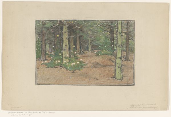 Curator: Theodor Alt's watercolor drawing, “Inside a Forest,” presents a dense woodland interior, emphasizing vertical tree trunks and filtered light. What strikes you first about this work? Editor: The way the light dapples through the trees is immediately captivating, creating a serene almost sacred space. There’s something both inviting and slightly foreboding in the density and repetition. Curator: I agree; forests often hold potent symbolic weight. Historically, the forest represents a place of mystery, of transformation, of testing – think of fairy tales. The cool greens and browns here, though, don't suggest outright danger but rather quiet contemplation. Do you notice the eye following the implied path into its depth? Editor: Absolutely, the path acts as a compositional guide. It draws the eye deep into the picture plane. Notice how Alt uses lighter and darker shades of watercolor to suggest volume. See how the variation allows us to appreciate each tree's form and spatial relationship to the others. Curator: And beyond a simple depiction of a place, I think it whispers about our relationship with the natural world. These forest interiors resonate with cultural ideas of nature as both refuge and a space for self-discovery. Editor: True, the meticulous rendering of the trees is crucial. The layering creates depth, the forms repeat, and rhythm establishes harmony between natural elements. It's quite visually arresting, this harmony, but more than that—there’s also an undercurrent, suggesting impermanence and the relentless growth/decay cycle that underlies nature’s visual beauty. Curator: So you're attuned to both its beauty and what that implies in visual metaphor? I am too, but in a simpler idea. Consider that, despite a somewhat undefined dating, we understand it's an en-plein air watercolour. This adds a layer: not only do we see a forest, but in this image is the act of seeing this landscape preserved. Editor: Precisely. I leave this image reflecting how we see, render, and transform the world into resonant patterns—which, in their arrangements, communicate across ages.