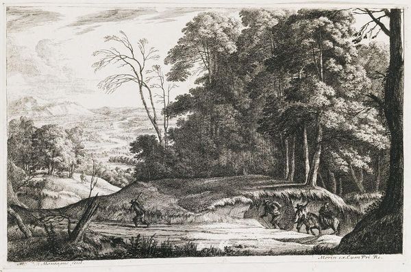 Editor: This is a small etching titled "Landscape," by an anonymous artist. It feels very theatrical, like a stage set. What story do you think it tells? Curator: It certainly evokes a sense of drama! I see a performance of gender roles. The characters seem caught between the natural world and the societal structures represented by the buildings in the background. What does the artist want us to ask about these social constructs? Editor: So, you see a tension between nature and society? Curator: Precisely! And within that tension, what are the power dynamics at play? Who is performing for whom, and why? The framing of the trees and buildings almost force us to be complicit observers. Editor: I never thought of it that way. It's like we're being asked to question our own role in the scene. Curator: Exactly! And art should push us to question the status quo, even if it means interrogating our own perspectives. Editor: Thanks. I will definitely keep that in mind as I continue my studies.