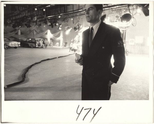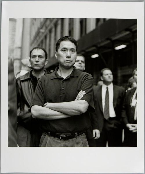Editor: This photograph by Kevin Bubriski, titled "Untitled (businessman in black overcoat)," features a group of people in what looks like a construction zone. It's black and white, giving it a somber, almost documentary feel. What strikes you about this image? Curator: It’s interesting how Bubriski captures this moment. The black and white tones, the scaffolding in the background... It suggests a city undergoing transformation. Who is being transformed, and who is witnessing it? The gaze of the central figure is directed up and away. What's he looking at? How does this photograph reflect or critique the values of the business world? Editor: So you're saying the setting and composition invite us to consider the power dynamics at play within urban development? Curator: Precisely. The image is not just about capturing a moment, but about what that moment represents in a larger societal context. Bubriski invites a social commentary. Editor: I never considered the layers of social commentary in this image. It definitely gives me a different perspective. Curator: These layers offer ways to think about social shifts, and how imagery participates in this dynamic process.