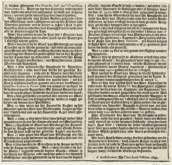 Editor: Here we have "Siege of Bergen op Zoom, 1622" created in 1622 by Nicolaes van Geelkercken. It's an engraving on paper. It appears to be mostly text. I’m curious – what symbolic role did text play at this time? Curator: It’s a broadside, meant for wide distribution, a snapshot of current events, yes. But it’s not *just* information. Think of the visual power of language in the 17th century. Words weren't just descriptive; they carried the weight of authority, of religious and political ideology. The sheer act of printing something gave it a kind of permanence and undeniable truth, wouldn't you say? Editor: That’s interesting. It's like the act of printing itself became a symbol of truth? Curator: Exactly! Consider the context. The Eighty Years' War was raging, and this image commemorates a siege. The typography, the layout, these elements reinforce the message, building patriotic feeling. What emotions might a contemporary reader experience looking at this today, thinking about symbols of battle? Editor: So, it's about memory, not just the event itself? I'm trying to connect the visual presentation and its intention with a very particular time and cultural setting. Curator: Precisely! The symbolism inherent in disseminating this “news” through a print magnifies the power of communication at the time, reminding everyone about their shared history and experience, in a way that reflects power and knowledge. Editor: It almost gives new meaning to "the pen is mightier than the sword." Thanks. Now I see how an ostensibly simple historical print embodies many other things beyond its original use. Curator: Indeed, the layers of symbolism continue to evolve, reminding us that images—and words—carry meanings far beyond their initial context.
