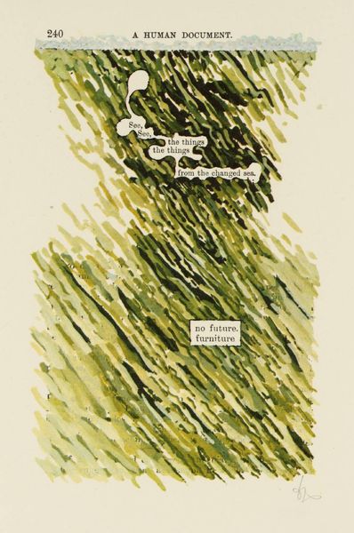 Curator: Gosh, what a dreamy little thing. At first glance, it feels like looking through a child's eyes, all soft greens and these rather melancholic looking tulips. Editor: This is an altered page by Esq Tom Phillips from his work "A Human Document." The artist has painted and collaged onto the existing printed text, creating a new visual and textual layer. Curator: Yes, it's like he's taken someone else's story and whispered his own secrets over it. "This good book look for nobody" floats like a lost thought. It makes one wonder about abandoned ideas, doesn't it? Editor: Absolutely. The use of found text and erasure reflects a broader postmodern critique of authorship and originality. The phrase "condemned to life" resonates with existential themes prevalent in postwar art. Curator: Condemned to life—isn't that the truth? Though it's a slightly heavy concept floating above those delicate flowers. It's quite a juxtaposition. Editor: Perhaps it's a commentary on the ways in which language can both liberate and constrain us. The overlaid text creates a tension between what is said and what remains unsaid. Curator: It's a tender, almost secretive piece. Editor: Indeed. It invites us to consider the hidden narratives within existing structures.