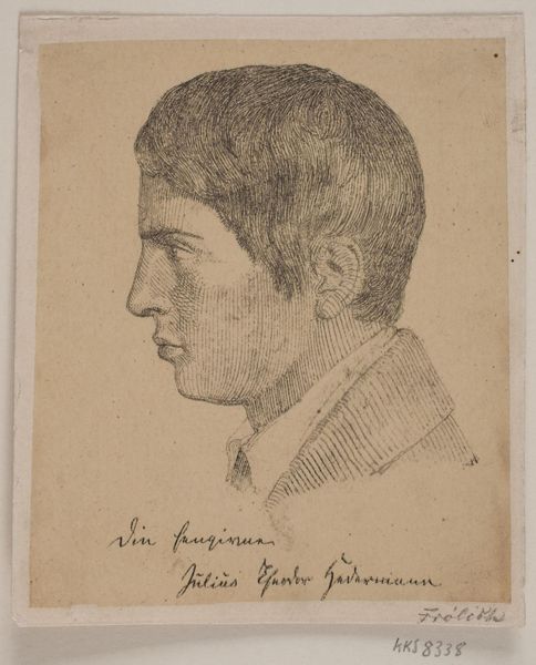 Curator: This print from 1840 is titled "Julius Theodor Hedermann," created by Lorenz Frølich. It's held at the SMK, the National Gallery of Denmark. What strikes you immediately about it? Editor: It's the precision of the engraving that grabs me. Look at how those meticulously etched lines on a grounded paper establish form, particularly defining the sitter’s profile and rendering depth across such a narrow value range. Curator: Absolutely. Frølich was working within a tradition of portraiture heavily influenced by Romanticism. Prints like these gained popularity because they democratized art and fame. A collector class formed alongside the industrial processes for reproduction. These prints would circulate and reinforce social hierarchies while documenting figures for posterity. Editor: Indeed, the mechanization of reproduction techniques transformed how images were circulated. Think about the artist's labor involved. Transferring an image from a sketch to an engraved plate took a specialist craft, it's a reminder that artmaking at the time involved many more hands and far more preparation than we give credit. The precision also speaks to standards of the time. Curator: That speaks to the public role of portraiture, yes. And it shaped social expectations and influenced how individuals were perceived and remembered in a rapidly modernizing world. The sitter, though not known to modern audiences, was very likely a man of significance in Danish society at that time, and that drove production and guaranteed audiences for this art. Editor: The choice of medium isn't neutral, of course. Engraving elevated what might otherwise have been considered mere sketches or preparatory studies. The printing presses could churn these portraits out, fulfilling a demand. You can see why the social implications became huge. It represents industrial shifts rippling across portraiture, altering value judgments, the role of artistic labor, and how identity was recorded. Curator: Right, engravings helped create and cement reputations. And beyond artistic considerations, they highlight evolving class structures within art production and reception itself. I’ve always found Frølich’s engagement with contemporary figures incredibly insightful. Editor: For me, it's seeing that interplay between artistic skill, the physical nature of engraving and the socio-economic contexts intertwined in a simple profile that keeps me thinking. Thank you for drawing my attention to these details!
