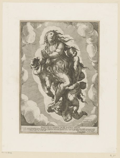 Curator: Welcome. We are looking at a baroque engraving from between 1620 and 1700, "Winged putto holding a cardinal's hat over a dragon head", attributed to Cherubino Alberti and now held at the Metropolitan Museum of Art. What strikes you most about it? Editor: The frenetic energy. There’s so much dynamism packed into such a small pictorial space! I’m intrigued by how Alberti uses such a graphic, linear medium to convey this sense of explosive, almost unstable action. Curator: Note the way the composition spirals. Alberti uses the strong diagonals created by the putto's body and wings, and then mirrors this in the serpent below, giving an overall sense of implied motion. He manipulates this relatively static medium, engraving, to create dynamic tension. Editor: Yes, and consider the labor invested in producing this print, a mechanically reproducible image intended, one assumes, for a wider audience. An interesting juxtaposition, this emblem of aristocratic power reproduced through a painstaking and demanding artisanal process. Who do you think comprised this audience, generally speaking? Curator: It's an interesting point you raise, certainly. One could read this, then, through the lens of semiotics. The dragon, for instance, often representing evil or chaos, is dominated here, subjugated by the cherubic form and overshadowed by the cardinal's hat – signs of faith and hierarchical power. Editor: It really underscores the inherent tension within art of this period: lavish displays of power and opulence created often through the intensive labour of skilled artisans, whose names frequently vanish in the historical record. Curator: We can interpret this as Alberti exploring themes of virtue triumphing over vice. He’s using recognizable iconographic language—a visual shorthand—that speaks directly to an educated viewer familiar with classical and Christian symbolism. Editor: So much rich information packed into the physical object itself. From the labor of the engraver to the hierarchical imagery represented, the making and its material certainly have a great deal to say. Curator: Indeed, a work steeped in its era, both technically masterful and narratively complex. Editor: Definitely one for reflection, as it's about skill and artistry and social forces and relationships of power all at once.
