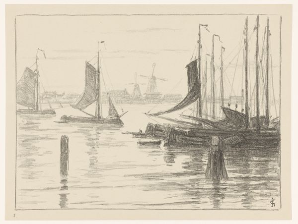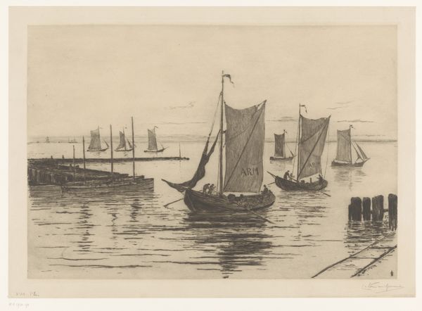 Curator: This etching, created around 1880 by Carel Nicolaas Storm van 's-Gravesande, offers a serene view of the Haven in Dordrecht. The work uses a delicate realism to capture a peaceful moment in this Dutch city. Editor: Immediately, I’m drawn to the stillness. There’s something almost ghostly about the light, which softly diffuses over the water and the buildings in the distance. It feels like a memory. Curator: That sense of quietude aligns with the period’s interest in capturing fleeting moments. Storm van 's-Gravesande was greatly influenced by the French etchers of the time, aiming to capture an immediate impression of place. You can see it in the quick, precise lines that describe the wooden structures of the harbor. The etching as a medium helped democratize art, creating opportunities for the distribution of images like this, feeding a growing middle class audience interested in these types of landscapes. Editor: Absolutely, and the focus on labor is subtle but present. You can observe that figure at work on the boat. There is the implied labor, of course, the docks suggesting trade. The haze softens it. I wonder, who was this aimed at? Would working-class citizens have been able to access such an image of their everyday lives? Was this realism intended for the bourgeois drawing rooms? Curator: Those are critical questions. The image's consumption likely took place in a realm divorced from the lived experiences of Dordrecht's working class. It romanticized elements of their environment. But beyond the sociopolitical questions, this work demonstrates technical mastery, notably how van 's-Gravesande creates depth and atmosphere using only line and tone. The etching beautifully highlights the interplay of light and shadow, particularly across the water's surface. Editor: True, I appreciate the interplay of light. Looking at how he renders the reflections of the masts and the boats really brings to life a dynamic aspect of reality. There’s a deceptive simplicity here, making it almost easy to miss that beneath the surface is always social and political significance to capture the viewer's reflection. I think examining what this says about the era it came from is interesting too, even to a contemporary audience, as much as the work’s pure aesthetics. Curator: I agree completely. Exploring the historical context enriches our interpretation. Appreciating it is essential in allowing us to unpack assumptions. Editor: So, next time you stand on a harbor front, remember there is an image like this awaiting you from 1880, bridging the gap.