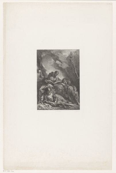Alexander Runciman created this etching called "Geest van Crugal verschijnt aan Connal", but the date is unknown. Here we have a classical scene rendered with dramatic chiaroscuro. Notice how the stark contrast between light and shadow models the muscular forms of the figures, enhancing the emotional intensity. The composition is divided into two distinct zones: the solid, grounded figure of Connal and the ethereal, floating spirit of Crugal. Runciman uses line and form to explore themes of the sublime and the supernatural. The spectral figure destabilizes our perception of reality, and the solid form of Connal anchors us to the earthly realm. This interplay reflects broader philosophical concerns of the time, where the rational and irrational were constantly being negotiated. Ultimately, Runciman's print invites us to contemplate the boundaries between the physical and spiritual worlds. The formal tension within the work—between solidity and ethereality—becomes a powerful means of exploring human perception and understanding.