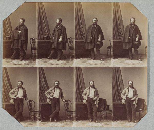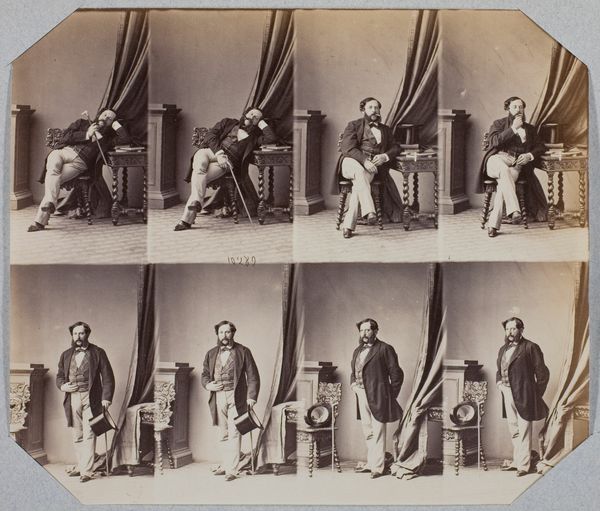 These eight portraits of Crown Prince Willem were produced by André-Adolphe-Eugène Disdéri, a French photographer who lived between 1819 and 1889. Disdéri was a pioneer in the field of portrait photography, particularly known for popularizing the carte de visite format. During the mid-19th century, photography emerged as a powerful tool for constructing and disseminating images of identity, particularly for those in positions of power. Here we see a distinguished gentleman, the prince, captured in a series of poses that attempt to convey authority and sophistication. However, there is also something quite repetitive about the composition, the subject is always standing in the same position in front of the same prop. The mass production of these images made the Prince's image widely accessible. In this way, photography democratized the medium of portraiture, even as it reinforced existing social hierarchies by immortalizing the likeness of the elite. We are left with the question of how these images, intended to project an ideal, can reflect a much wider range of social realities.