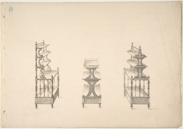This anonymous drawing features various designs for table legs and jardinières. Note the recurring motif of the pedestal, a structural support elevated to an art form, hearkening back to classical antiquity, where such forms were integral to temples and public monuments. These pedestals were not merely functional, but served as symbolic supports for deities and emperors, communicating power and stability. We see this echoed through the ages, during the Renaissance, in portraiture, where architectural elements assert the sitter's noble stature. Observe how the pedestal, initially a symbol of the divine and powerful, is recontextualized here as a mere support for flowers. Does this evolution diminish its grandeur, or democratize it, bringing the noble form into the domestic sphere? It invites us to ponder the cyclical nature of symbols: they rise, fall, and are reborn, constantly shifting in meaning, yet forever tethered to their origins.