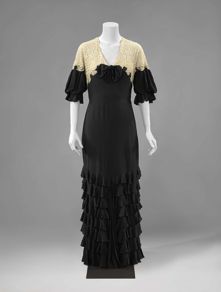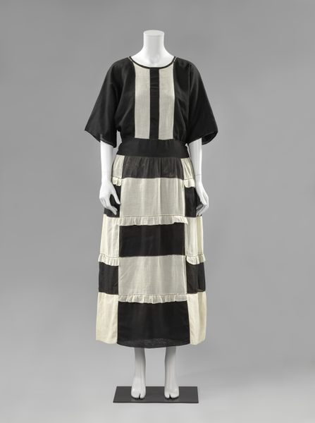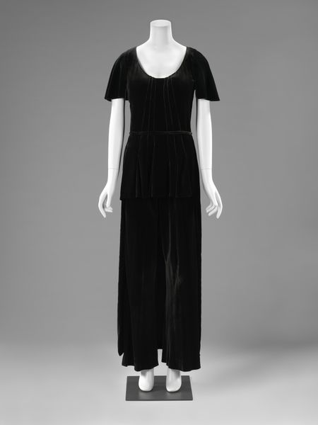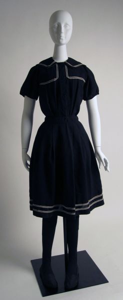 Curator: Oh, my goodness, look at this… it's giving me Victorian chimney sweep vibes! But, like, make it fashion. Is that even possible? Editor: Indeed. What we're looking at is the "Gym Suit," crafted by the Columbia Gymnasium Suit Co. sometime between 1895 and 1899. It resides in the collection of the Metropolitan Museum of Art. The garment is textile; a curious piece of historical sportswear. Curator: Sportswear? That's wild! I wouldn't exactly call it streamlined. All that fabric gathered around the ankles looks pretty cumbersome, and this navy-blue cotton is giving off all kind of heavy vibes! Editor: It speaks volumes about societal expectations and limitations imposed upon women during that period. Note the long sleeves, the high neckline; physical exertion, carefully concealed. The loose silhouette prioritizes modesty. It uses bloomers so ladies can ride bikes with elegance but not see any ankle... how prudish! Curator: Okay, but also kinda smart. Fashion always reflects culture. You’re hitting the gym in a straight jacket… but hey, at least you’re exercising? Maybe? But I must say, those gathers do give the whole piece an interesting bulbous shape. And look how it plays with form! Editor: Precisely. While seemingly restrictive, the design allows for a range of motion—the inverted pleats and sailor-like top show innovative use of materials within societal norms, a controlled rebellion through form. Semiotics of bloomers indicate shift from repression to some liberty and movement. The sailor collar suggests how much the sailor image has evolved from work apparel to the play uniform. Curator: It really highlights the contradictions of the time. Striving for freedom and clinging to propriety. A weird marriage. Editor: An astute observation, considering how constrained people in general where. One could suggest the 'Gym Suit' as it stood for exercise in its time; and it symbolizes struggle between innovation and constraint... Curator: I never thought bloomers could carry so much philosophical weight. This was eye-opening and the dress is kind of beautiful in it's simplicity. I see all this "clothing theme", but it still works as art. Editor: I fully concur with your perspective. It challenges us to re-evaluate preconceived notions of beauty. This artifact—beyond its utilitarian purpose—represents how art mirrors cultural zeitgeist and innovation.
