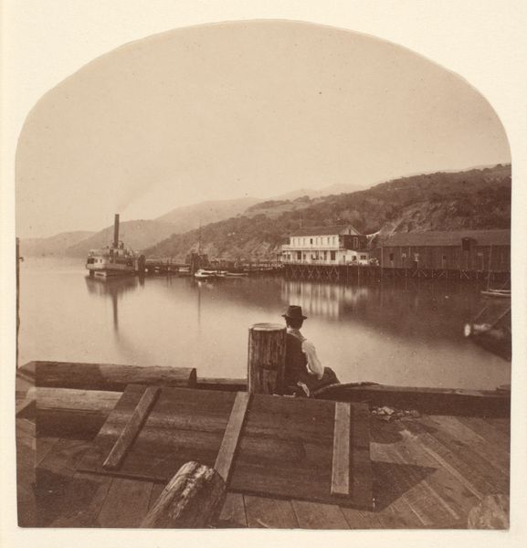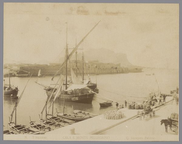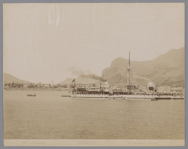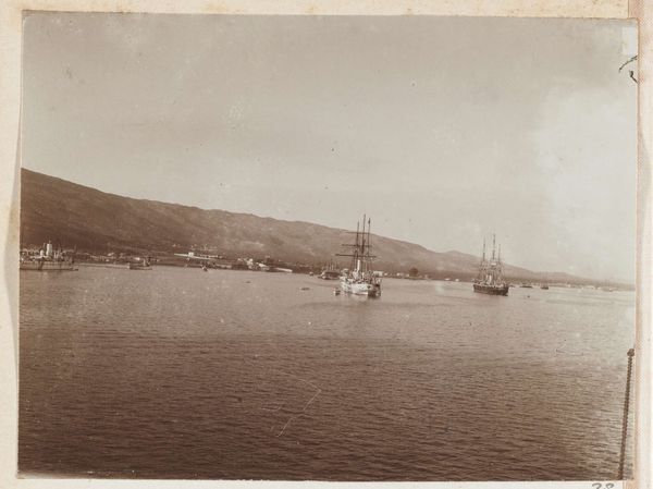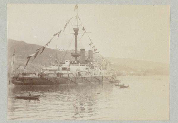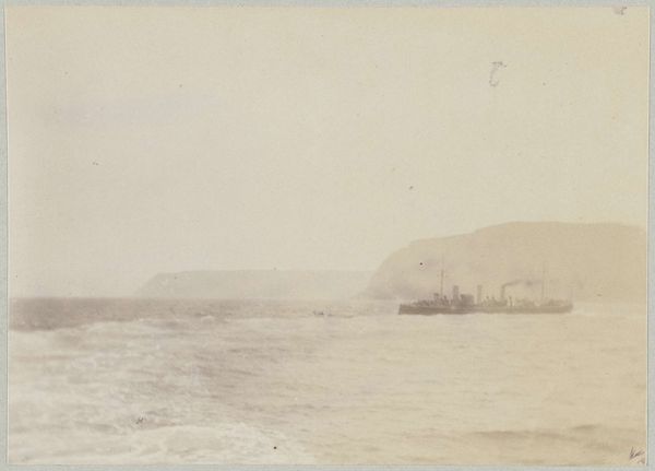Curator: We’re looking at "Schip 'Kaiser Wilhelm II', Bergen, Noorwegen," a photographic work, dating back to somewhere between 1870 and 1900, by Knud Knudsen. Editor: Wow, this is such a dreamlike photograph, isn't it? The way the ship is sailing into the unknown and all the fog surrounding the land mass. Gives me the chills but also fills me up with joy! Curator: Indeed. Knudsen's photography provides significant insight into the societal dynamics of late 19th-century Norway. By focusing on maritime subjects, particularly ships like the Kaiser Wilhelm II, he inadvertently captured a sense of burgeoning industrialization. Note the way he framed the shot. Editor: Right? You can feel the grandness of the ship. Like, BAM! Industrial whoosh, but with a calm tone and gentleness to it. The haze, too. It’s all very deliberate. I bet he was one cool cat. Curator: Knudsen was more than a "cool cat"; he was a key figure in documenting Norwegian identity. "Schip 'Kaiser Wilhelm II'," for example, can be read as a symbol of the country's connection to global trade. But that perspective should take a closer look to the remaining negative space surrounding the ship to understand how it is connected. What's your view about it? Editor: Good point. See the blank space hugging the image? Totally invites contemplation. It’s as if it whispers, “Hey, slow down, dreamer. Let the scene speak to your core." It urges me to imagine untold narratives beyond what is visible and makes the photograph even more dramatic. Curator: Exactly. That's a perspective rooted in phenomenology; considering the image beyond just documentation but instead as a deeply personal experience. Editor: Totally! Thanks to it, I’m ready to sail! But also ready to ponder the Norwegian economy while wearing a cool wool sweater. I dig it. Thanks, Knud! Curator: Well, the pleasure was all mine. It’s these intersections of the global with the deeply local, that reveal photography’s complex role during that era.