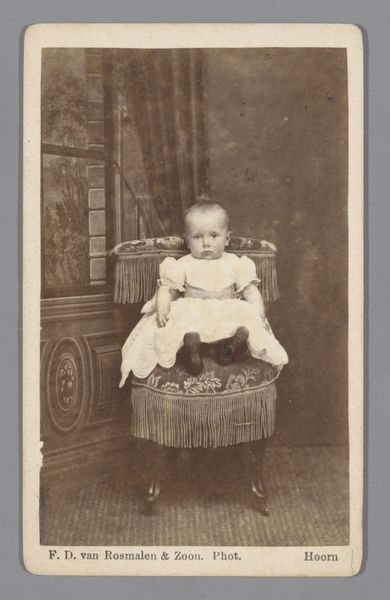 Curator: Let's take a moment to examine this fascinating gelatin-silver print, “Portret van een onbekend kind in een kinderstoel,” dating from around 1900-1914 and photographed by Joël de Lange. The work presents an unidentified child seated in a Victorian-era stroller. Editor: The first thing that strikes me is the visual weight of the bonnet; it practically engulfs the child! The frilly white fabric juxtaposes rather strongly against the somewhat distressed and functional aesthetic of the metal and wooden stroller. Curator: That tension is certainly present. I see this image speaking to the socio-economic context of the era, specifically the transition into a time of greater industrialization and the increased commodification of childhood. The choice of the gelatin-silver process, being easily reproducible, points to photography's rise in popularity within portraiture for an increasingly larger segment of the population. It's a rather affordable and reproducible method. Editor: True, yet I’m more drawn to the bonnet, this massive symbol of infant purity and innocence—practically a halo! The Victorians really leaned into the Madonna-like imagery with children, dressing them as miniature adults, innocent but trapped by expectations. And the stroller—note the wheels—feels almost cage-like, confining yet protective. Curator: I wonder how conscious de Lange was of constructing that narrative or merely recording a scene. But regardless, the stroller design is quite striking. Its materials - the wood, metal, even the fasteners- convey a handcrafted sturdiness now lost. Editor: To me, this composition tells a more significant story of that child, suspended between the artificial construct of innocence and the sturdy realities of a world just beyond their immediate grasp, symbolized by that almost-menacing carriage. Curator: It makes you ponder the labour involved in creating this seemingly simple image; not just in developing the photograph itself but in creating the props, the clothes, and in transporting the equipment required at the time. All those actions become inscribed into the artwork as well, becoming part of its meaning. Editor: That’s fascinating—the layered physicality. I'm seeing this now as a powerful artifact of cultural ideals imposed upon our understanding of the very concept of "childhood". Curator: Exactly! It's in that interplay between process and symbolic resonance that the real complexity, and indeed value, lies within the photograph. Editor: Indeed, an exploration that transcends merely the image, echoing through our present-day ideas and material production of images.
