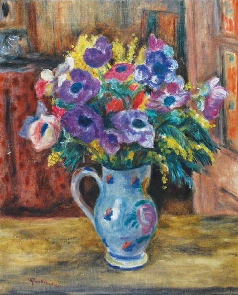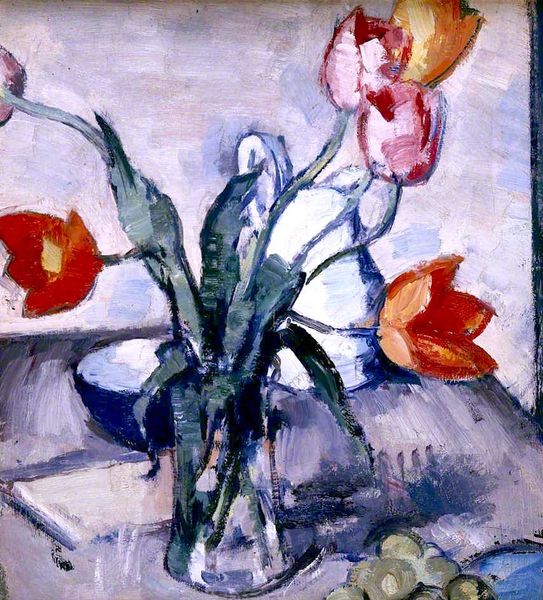 Curator: Samuel Peploe’s "Tulips," painted in 1923, offers a delightful insight into the Scottish Colourists movement, particularly how they engaged with Post-Impressionist ideas. Editor: It's striking how Peploe's bold, almost aggressive brushstrokes animate an otherwise simple subject. The colour relationships—particularly that muted, almost bruised, purple against the brighter pinks and reds—create a restless visual energy. Curator: Absolutely. These artists, the Scottish Colourists, positioned themselves in an interesting relationship to the conservative Scottish art scene of the time, acting as a bridge to European Modernism and shaping cultural attitudes toward it in Scotland. Peploe spent extended periods in France absorbing current Post-Impressionist practices. Editor: And it’s very evident here, look at the flatness of the picture plane! It reminds one of Cezanne's flattening of space and bold outlines that create form as much as delineate it. And this attention to composition--that dynamic tension between the verticality of the blooms and the horizontal tabletop! It seems self-consciously modern. Curator: Right, and still life paintings allowed Peploe and his cohort like Cadell to experiment without making direct statements, offering them latitude when showing this style in more conventional, portrait-dominated public displays in galleries at the time. This gave them more social acceptance, if you will, into the somewhat traditional gallery climate in Scotland. Editor: So, the still life, a seemingly innocuous genre, actually provided an avenue for formal experimentation and cultural negotiation? Intriguing. Yet, divorced from this knowledge, I appreciate the almost childlike simplicity in its execution; a raw but earnest attempt to wrestle colour into form. Curator: It certainly captures a fresh sensibility, revealing how art both mirrors and moulds the society from which it comes. It demonstrates the capacity of artists to test new ideas in contexts of historical expectation. Editor: Well said. Seeing this "Tulips" afresh offers new insight into formal artistry with complex history.