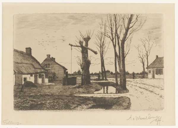 This is Gerardus Johannes Roermeester's "Ophaalbrug bij een boerderij" or "Drawbridge at a farm", made using etching, a printmaking technique that depends on the controlled corrosion of metal with acid. Look closely, and you’ll see the fine lines that define the forms and textures. The image is made by drawing into a waxy, acid-resistant ground applied to a metal plate. Then the plate is exposed to acid, which bites into the exposed lines, leaving an impression that can then be inked and printed. What I find fascinating here is the way Roermeester uses the etching process not just to depict a scene, but to evoke a mood. The very texture of the etched lines contributes to the somber, slightly melancholic atmosphere. You can almost feel the dampness in the air, and the quiet solitude of the rural landscape. It's a reminder that the techniques an artist chooses are never neutral. They always bring their own history, their own set of associations, to the work.