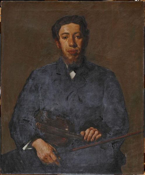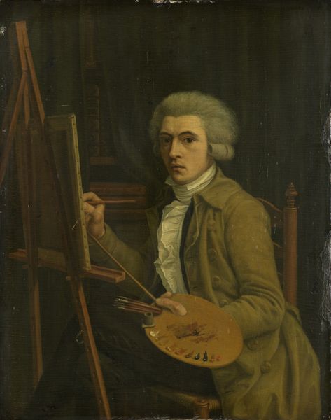 Curator: What an evocative image. We're standing before Camille Corot's self-portrait, dating from 1825 and currently housed in the Louvre. The soft glow on his face emerges dramatically from the otherwise dark background. Editor: It’s so raw, so immediate. The brown and grey palette creates an air of intimacy, yet the figure is posed like a statue. There's a sense of the artist wrestling with how he wants to be seen. Curator: Precisely. The darkness in the background recalls the "tenebrism" often seen in religious iconography where shadows amplify the presence of sacred figures. By placing himself within this framework, Corot perhaps hints at the elevated status of the artist. Note also how the palette he holds acts almost as an emblem of his profession. Editor: It’s a beautifully understated palette. The olive jacket, the muted red cravat – he seems acutely aware of how to portray himself. I see an echo of earlier workshop practices. Look at the rough texture in the weave of his coat; Corot is not only the creator of the image but also its fabricator. Curator: Consider the direct gaze – Corot stares outwards, almost confronting the viewer. Do you perceive any apprehension in that gaze? This self-portrait could also be read as an exploration of identity and the anxieties of artistic creation. The shadows are concealing but they highlight certain emotional complexities. Editor: Perhaps. It seems more staged than revealing to me. In foregrounding the means by which paintings get made – through his easel and palette– he offers us a materialist understanding of creativity. This resonates with shifting social attitudes during the rise of Romanticism in Europe. I'd suggest his stare, then, is both defiant and self-aware in the face of new economic forces that would have impacted an artist’s self-perception at the time. Curator: That's insightful. Ultimately, this painting reminds us of art’s capacity to convey complex meanings using relatively simple, symbolic arrangements. It serves as both an invitation and an enigma. Editor: For me, it’s an insight into artistic labor during an era where art production started intersecting more directly with marketplace forces, so, fascinating on many levels.