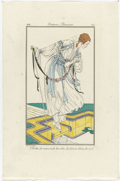 George Barbier made this fashion illustration, number 51 from Journal Des Dames Et Des Modes, in 1913. Look at the thin lines of the dress, like crisp, controlled breaths on paper, each one distinct yet flowing together, it's all about the gesture. The color palette is restrained, a whisper of blue, gold, and lavender. It's interesting how flat everything is. Barbier emphasizes the surface, denying depth. Those stripes on the dress, they're not just decorative. They are a way of building form while acknowledging its artifice. There's a tension between representation and abstraction, where the dress becomes a field of visual play. There's something of Aubrey Beardsley in this, a similar interest in line and surface, but Barbier is less overtly decadent. Both artists show us that art is an ongoing conversation across time. I find myself coming back to the blue sash, it’s so controlled and yet so free. It's a reminder that art doesn't need to shout to be heard.