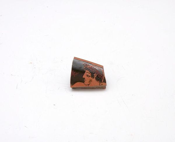 Editor: This is a fragment of a kylix, or drinking cup, by Makron. It's a small piece, depicting a frontal torso and a right hand. What's striking is how intimate the fragment feels, despite its size and incompleteness. How should we interpret this? Curator: Think about the function of the kylix itself. It’s a vessel for communal drinking, often used in symposia, gatherings that were exclusively male. How might this context inform our understanding of the figure depicted? Is there a suggestion of eroticism? How does its fragmentary nature alter that reading? Editor: I never thought about the connection to the male gaze and the symposium. Thanks, that adds another layer! Curator: Exactly! Considering the historical context shapes the way we confront art and its underlying social narratives.