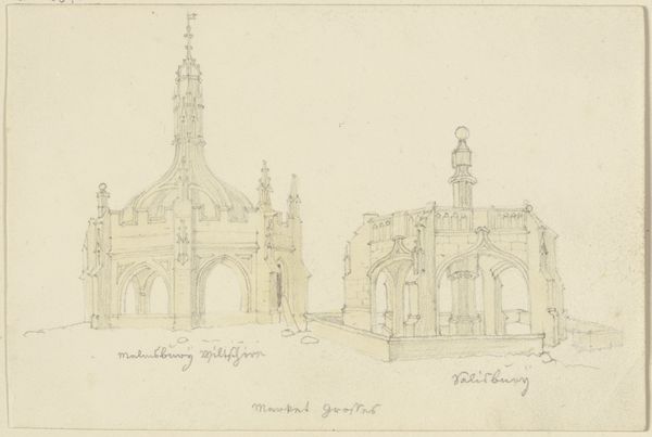 Curator: My eye is immediately drawn to this delicate sketch. We're looking at a work called "Abbey Gateway, Tewkesbury; Figure from Tomb at Great Malvern (verso)", made around 1816. It’s an etching on paper with pencil, currently residing here at the Metropolitan Museum of Art. Editor: There's a dreaminess to it, isn’t there? Ghostly even. As if I'm peering at this place through time itself. A building depicted by whispers of pencil… Curator: The anonymity of the artist perhaps contributes to that. Without a known author, it invites projection. One might consider this architectural study alongside similar sketches of the time. It mirrors the broader fascination with medieval structures during the Romantic era—a yearning for a perhaps imagined past. Editor: That Gothic archway! I am completely taken by that specific architectural marker of entering, passing from one domain to the next. I'd also wager the reverse features just as much presence, and yet is absent to us right now...like memory. Curator: Quite astute. The artist, whoever they were, demonstrates a clear interest in form and detail. Notice the precision of the linework and the effort to capture the textures of the stone. I read in those lines more than merely realism; I detect that fascination shaping an affective link that spans decades between artist, location, and the viewer, ourselves. Editor: Indeed, that's it: "affective link." In essence, you’re saying this sketch isn’t just documenting history but participating in it. What do we make of it, the viewer becomes the question. A bit unnerving. I think it holds something like the emotional timbre that old hymns hold. Do you hear the organ when you look at this image? I swear I can. Curator: You propose an interesting idea! Indeed, I feel this artwork serves as a reminder of how structures – and images of structures – persist as symbols, connecting us to past generations and their own relationships with memory and continuity. Editor: A ghostly abbey then, a reminder of permanence and of passing. All held by light touches. A really fantastic thing.