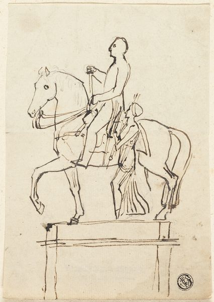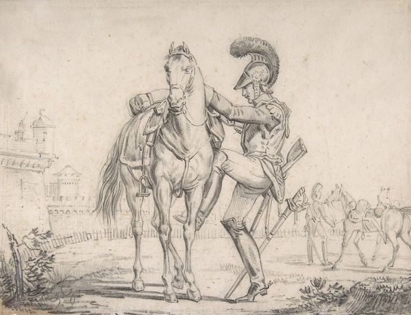 Curator: Here we have a drawing titled "Erewacht te Den Haag, 1811." Editor: It feels stiff. Very posed, almost like a mannequin display more than a real moment. Cold grandeur is what comes to mind. Curator: Indeed. Executed in 1811, this work, whose author remains anonymous, meticulously renders two soldiers, one mounted, with the medium solely pencil on paper. The style very deliberately employs Neoclassical principles. Editor: That pencil work, though, is fascinating. It’s so detailed, especially on the horse’s musculature and the elaborate braidings on the uniforms. It's controlled but lively, if that makes any sense. As if life is trying to fight its way into something very formally rendered. Curator: The composition strategically positions the standing figure to the left, grounding the composition, while the equestrian figure on the right introduces dynamic movement with the horse’s lifted foreleg. The contrast in their stances emphasizes rigid duty versus active engagement. Consider how line quality defines forms and textures, which contributes to the piece's representational accuracy. Editor: I find that really compelling, because the way it’s presented, that stiffness you talked about is also kind of vulnerable, in a strange way. The level of exactitude—it reveals a human desire for order and control in, perhaps, a very chaotic time. Is this Napoleonic? Curator: It certainly is, a point underlined by the themes evident here: the rigid formality, hierarchical depiction, and overall celebration of military might. The artwork embodies the socio-political climate of the Netherlands under French rule. Note how, even in what looks like a basic drawing, everything serves the grand narrative. Editor: Right. And yet that slight tilt of the horse's head, the tiny almost imperceptible details, makes me feel that artist may be seeing more of what they are painting; a kind of yearning, may be, hidden within this military order? Curator: An astute observation. "Erewacht te Den Haag" isn’t just about documentation; it encapsulates cultural values and power dynamics inherent in the historical moment it represents. Editor: Thanks. I think I’ll be turning over those thoughts on my walk today. It makes the viewing much more thought provoking.