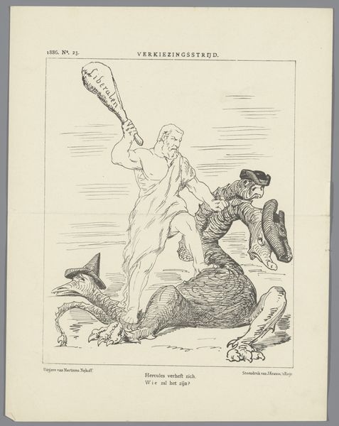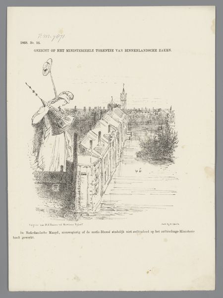 Curator: The downcast mood practically jumps off the page. She looks like she is giving up. Editor: This etching, "Spotprent over de Staatsschool, 1885," roughly translates to “Cartoon about the State School." It's the work of Johan Michaël Schmidt Crans. The scene seems rife with symbolism. Curator: Yes, the dejected female figure draped in classical robes holds a model labeled “State School” – the shadow behind her suggesting some national history. Editor: Her posture is quite telling, isn’t it? Shoulders slumped, gaze downward… there’s a real sense of regret or loss. The Dutch Maiden seems ashamed about this "missed submission". What kind of school are we talking about? The image is full of hidden symbols! Curator: Well, public education in the Netherlands experienced a period of intense political debate in the late 19th century, primarily involving public versus religious education, perhaps she stands on a metaphorical wasteland from which a cityscape and sailing ships sit, and a national icon is relegated to the back like some unwanted animal. Editor: Note the empty hat on a stick, positioned like a beggar's tool, I sense that a formerly confident institution is now an object of public shame. Given the context you describe, it looks as if Schmidt Crans uses potent symbolism here to critique the state of Dutch public schools at the time. Curator: Indeed. The 1880s witnessed fierce debates surrounding the funding and direction of state schools. Artists frequently engaged in these social dialogues through prints and caricatures intended for broad circulation. Editor: It’s intriguing how the artist combines realism and caricature here. There's something deeply melancholic about the discarded history in the lion; while the school seems a monument that has yet to happen. I appreciate its ability to spark deeper questions about Dutch identity and societal values in a time of major ideological tension. Curator: Understanding the history enriches our viewing of this poignant symbolic artwork. Crans clearly captured the sentiments of a particular social perspective through vivid caricature. Editor: I am left thinking about cultural memory and public discourse. This print invites to consider how visual rhetoric shapes understanding the past and influences conversations today.