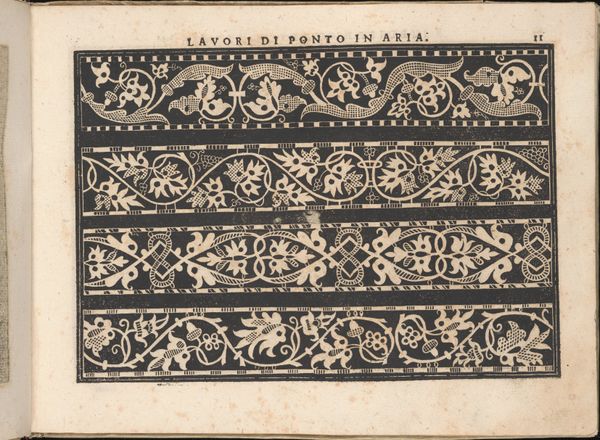 Curator: Looking at this page from Johann Sibmacher’s "Newes Modelbuch in Kupffer," dating back to 1604, it is a delicate example of engraving showcasing ornamental designs rendered in ink on paper. The book, of which this is plate 65r, is housed here at the Metropolitan Museum of Art. Editor: The patterns! It evokes a feeling of Renaissance opulence but distilled into something linear and restrained. There's a controlled energy in the symmetry and the delicate flourishes. Curator: Absolutely. Sibmacher was a significant figure in the history of pattern books. These weren’t conceived as autonomous artworks, but rather served as vital resources for artisans—weavers, embroiderers, and goldsmiths—providing designs they could adapt and incorporate into their own crafts. They played a role in standardizing style across Europe at the time. Editor: It is interesting you point out artisans borrowing from such pattern books! I'm struck by the repeated motifs; scrolling vines, stylized flowers, and almost heraldic elements, all intertwining. Do you think these botanical elements hold symbolic meaning tied to courtly life? Curator: Perhaps indirectly. The presence of specific flowers wasn't necessarily about singular coded meanings. Instead, they represented an elevated artistic aesthetic reflecting the tastes of the aristocracy that supported the arts and industry at the time. There was also burgeoning interest in botany! The printing of these patterns themselves made this sophisticated design accessible and therefore influential. Editor: It is such an interesting juxtaposition of what seems organic against clear geometric constraints, though! And look closely at how the composition invites interpretation. Is that some kind of crest? This reminds us of cultural continuity, how certain images and forms continue to resonate through various periods. Curator: Precisely. The legacy of pattern books lies in their democratizing force in making design pervasive, in laying a template, if you will. And as you rightly observe, these very patterns take their inspiration from broader cultural movements. The ripple effects are endlessly fascinating! Editor: Well, for me, I'm reminded that ornamentation does far more than simply adorn. It offers tangible links to collective identities, aspirations, and dreams that continue to be re-imagined today. Curator: I agree wholeheartedly! Examining an engraving like this pulls us into the matrix of cultural exchange in the early 17th century. And with that, it provides insight into how tastes and artistic movements come into formation.