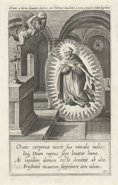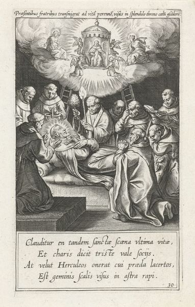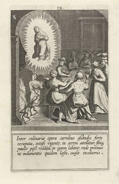 This engraving by Cornelis Galle I depicts Saint Catherine appearing before four learned men. The saint, bathed in light, hovers above them, a vision of divine knowledge. The scholars, absorbed in their texts, represent the pursuit of wisdom, a theme interwoven with Catherine's own intellectual prowess. Catherine’s ascendance and the scholar’s interest in hermeneutics reminds me of similar motifs found in illuminated manuscripts of the medieval times, where divine wisdom is a gift of the heavens, granted to worthy figures. The gesture of Catherine, hand outstretched, has echoes of classical orators, here transformed into a conduit of divine will. This recurs throughout art history, evolving from pagan deities to Christian saints, the embodiment of revelation. The pursuit of knowledge, seen here, engages us on a visceral level. It's a deep-seated human desire, and the depiction of Catherine, the enlightened saint, is a manifestation of this subconscious yearning. The cyclical nature of these images, from ancient rhetoric to Renaissance intellectualism, demonstrates the continuous cultural dialogue through symbols.