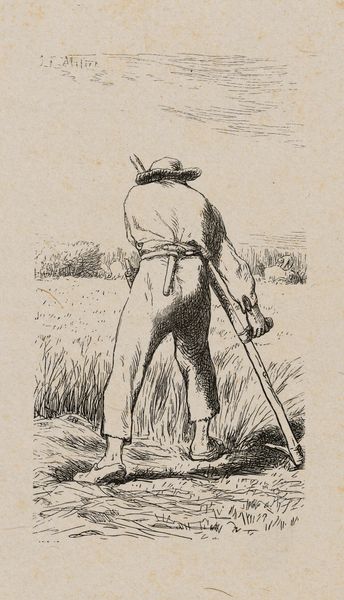 Curator: Well, well, this lithograph, "Quand on fait ses foins…" from 1846 by Honoré Daumier, certainly grabs your attention. Daumier was a master of social commentary, and this print, created using lithographic ink on paper, doesn't disappoint. What's your take on it? Editor: My immediate impression is utter chaos! The dynamism is incredible; the man is leaping across the freshly cut field with the energy of a startled frog. There is almost something performative in the absurdity. Is it just me, or is it humorous? Curator: Absolutely! It's Daumier at his satirical best. The title translates to "When one makes one's hay…and wants to supervise one's mowers too closely". We see the gentleman in a top hat, presumably the landowner, aghast, caught mid-air avoiding the blade of the peasant with his scythe. Daumier used caricature brilliantly to critique the bourgeoisie and their uneasy relationship with the working class during the July Monarchy in France. The tension speaks volumes about power dynamics in 19th century French society, and maybe today. Editor: Ah, there it is—the clash! You can practically feel the divide with that sharply angled scythe, the literal barrier between the two characters. He's even puffed up his cheeks in what is either outrage or simply to better navigate the hop he is doing over the cutting edge! There’s almost something grotesque and yet undeniably human about it. It’s a funny kind of mirror. Curator: Indeed. Daumier had a way of holding up a mirror to society, reflecting its flaws and absurdities. The dramatic contrast in clothing underscores the socio-economic disparities but also speaks to his place and agency in that agricultural tableau. While we might now view this as high art in the halls of a museum, pieces such as this were originally featured in magazines. It speaks to the evolving role of the art object but, as you say, it still resonates powerfully today, especially as ideas of work, privilege, and exploitation come to the fore once again. Editor: It’s interesting to think that the piece—one so of the people—ends up behind the institutions of the very class it's making fun of, right? And now we can be tickled or horrified… or, dare I say, see the satire in ourselves? Well, I, for one, feel seen. Thank you, Honoré Daumier! Curator: A sentiment I very much echo! Thank you.