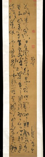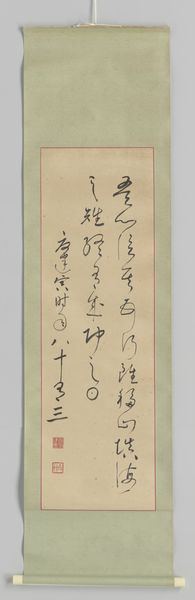 Ryōkan Taigu created this hanging scroll, “Chinese Poem: There is a bamboo grove around my house,” using ink on paper. Notice how the paper support, with its inherent absorbency, is crucial to the artwork's impact. Ryōkan skillfully uses a brush to explore ink's variable density, creating nuanced calligraphic forms. The characters range from dark, bold strokes to light, almost ethereal touches, guided by controlled, rhythmic movements. The way he loads the brush with ink and then applies it to the paper contributes to the expressive range. This is more than just writing; it's a performance captured in material form, deeply rooted in the Zen tradition. Ryōkan was a Buddhist monk known for his simple life, reflected in his choice of basic materials. Unlike many contemporary artists who sought luxury materials, he favored humble means, underscoring a life of asceticism and reflection. His work is a testament to the idea that profound expression doesn't require elaborate resources, but rather a deep engagement with the immediate world.