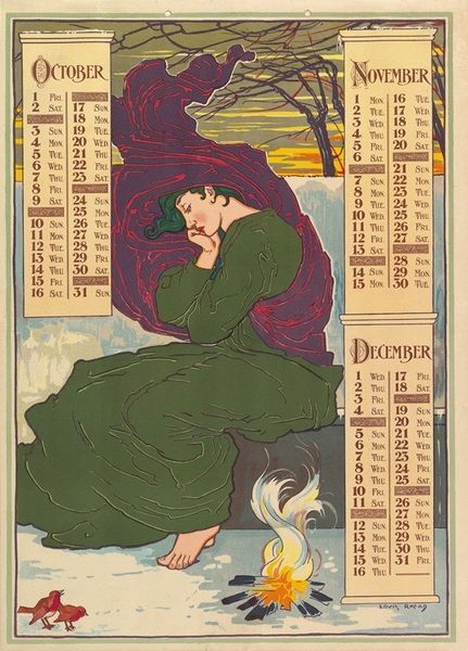 Curator: Louis Rhead's poster "April, May, June" from 1896 certainly captures a particular mood, doesn’t it? The languid figure, the sunflowers...it feels very turn-of-the-century. What strikes you most about it? Editor: Well, aside from how beautifully Art Nouveau it is, I notice how the woman is just kind of… collapsing against the calendar. She seems really tired. What do you see in this piece beyond the aesthetic appeal? Curator: Absolutely. I think we need to consider the broader context of women's labor in the late 19th century. Industrialization and urbanization had created new roles for women, but these were often accompanied by grueling working conditions. Editor: You think she might be a representation of the working woman then? Curator: It's one possibility. Perhaps Rhead is commenting on the exhausting nature of modern life for women. Note her ornate clothing juxtaposed with that weariness in her face. Is she a participant or a victim in this rapidly modernizing world? The sunflowers themselves, while beautiful, could symbolize the constant pursuit of light, of progress, which demands so much from the individual. The figure being literally part of the calendar too implies a strong binding. It feels like it transcends a pretty image. What do you think about that tension between beauty and exhaustion? Editor: That's fascinating! I was just seeing a pretty picture, but now I'm thinking about all the pressures on women, even back then, masked by these beautiful art aesthetics. I definitely learned something new. Curator: Precisely. It encourages us to ask important questions. To consider whose stories and realities were perhaps less visible in those beautiful, ornate images from the past.