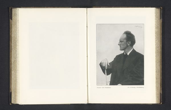 Editor: Here we have "waarop de resultaten vorm kregen in de mantelresolutie met de bijbehorende briefwisseling," possibly from 1949, a print or photograph currently held in the Rijksmuseum and attributed to Regeringsvoorlichtingsdienst. It has a slightly somber feel. I am struck by the contrast between the warm toned page of the book on the left, and the grayscale photo, depicting a man in deep concentration, seemingly at work with paper and ink, surrounded by other people. How do you interpret the formal elements in this work? Curator: Immediately, I am drawn to the strong diagonal line created by the subject's posture, directing our gaze from the lower left to the upper right of the photographic print. This line is countered by the horizontal stacks of paper, creating a visual tension within the composition. Notice the interplay between light and shadow across the depicted image, sculpting the man's face and adding depth. The repetition of rectangular shapes – the papers, the table, even the man's jacket–contributes to a sense of order, but do the placements make you wonder about the surface? Editor: I see it! There is a subtle rhythm in the placement of objects. However, the warm tones of the background seem separate from the image, more of a frame than part of the artwork itself. How do you see those disparate elements working together? Curator: Precisely. The juxtaposition creates a unique spatial dynamic. Consider the texture inherent in the printing, evident even in reproduction: the grainy quality, the slight imperfections in the tonal range. How does the contrast with the smoother, warmer surrounding page material affect your reading of the image? Editor: It almost feels like two separate pieces, a realism photo pasted into an artistic rendering, further enhancing the effect of this picture. That said, looking at how form works as a language, I’d not considered tone to this depth! Thank you. Curator: And I appreciate the reminder of how vital these subtle visual languages remain.
