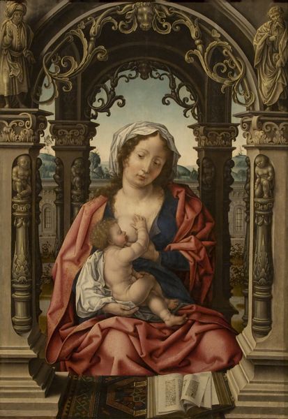 Curator: This oil painting presents us with "Madonna and Child," attributed to Francesco Salviati. While its specific creation date remains unknown, the artwork certainly situates itself within the Italian Renaissance tradition. Editor: Well, first glance? Serene. Almost melancholic, if that’s even possible when you're dealing with, like, the ultimate symbol of hope. Her eyes are cast downward in what looks like sadness or contemplation. The muted palette really amplifies the quiet mood of this portrait. Curator: That subdued palette is quite characteristic of the High Renaissance, actually. And consider the social climate surrounding representations of the Virgin Mary during this period—it was a pivotal time. Artists wrestled with how to depict both the divinity and humanity of religious figures. Editor: Right, because it's not just a painting; it's a statement about power, religion, the patriarchy, all that jazz. But purely aesthetically, that interplay of light and shadow—it’s practically whispering secrets, wouldn't you agree? There is a sense of soft volume, isn't it? Curator: Yes, note especially the artistic use of sfumato which helps to create softer edges with transitions of light and shade. We can think about how that pictorial device functions as a vehicle of religious awe here. Editor: That glow seems less divinely inspired and more skillfully applied. It directs you, almost manipulates you, into focusing on the facial expressions—or lack thereof. They're playing it cool, these Madonna and child combos. Curator: Their composure mirrors societal expectations. How are women constructed and staged, especially in paintings? In which sense did these artworks enforce traditional values within the domestic space? Editor: Fair point. It's the 'Keep Calm and Carry On' of the Renaissance. It certainly offers an ideal image of the holy family that is at once reverent, serene, calm and untouchable. Curator: Exactly. And perhaps we can even reflect on how these images impacted the role of women during the time? The social role of the Holy Mother was a significant component. Editor: So much more than just 'art,' right? Looking at it this way gives even greater depth to the artwork. And here I was just going to say how pretty it looks. Curator: Precisely! Considering all of these influences can add a further level of depth when experiencing art.