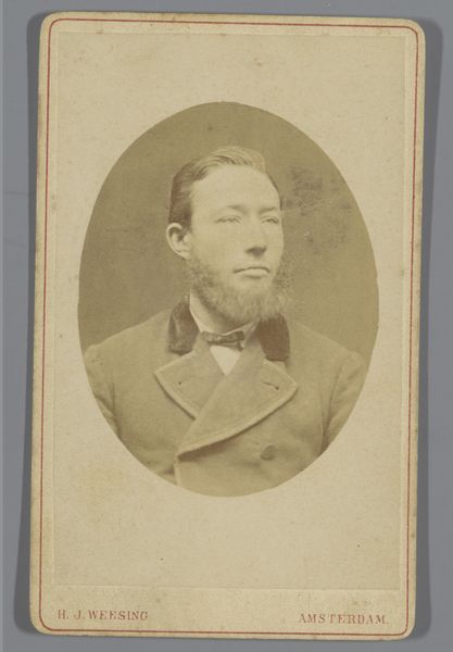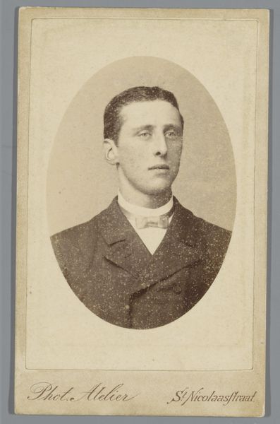 Curator: This is an interesting portrait. It’s titled "Portret van een onbekende man", and we believe it was created sometime between 1866 and 1876 by Hendrik Nicolaas Waalewijn. The piece is a gelatin-silver print, a very common method for portraits during this period. Editor: The mood is rather… wistful, wouldn't you say? There’s a certain vulnerability in his expression, like he's peering out from another time and place. A little shy, perhaps. And it is tiny – surprisingly intimate in its scale, even! Curator: The gelatin-silver process really speaks to that. These photographs became almost like tradeable commodities; people sought affordable ways to record their likeness or those of loved ones, driving a demand that shaped photographic studios into quite industrialized settings. Mass portraiture as an expression of shifting social classes. Editor: Indeed. The light has a lovely softness about it – diffusing around the planes of his face so subtly… almost a painting but with the bite of stark realism, or maybe it's nostalgia creeping in? This piece seems incredibly accessible to our modern eyes as an easily produced, repeatable commodity from times gone by. Curator: Absolutely. The accessibility of the materials used--gelatin, silver, glass negatives—the technology helped democratize portraiture, allowing even common individuals to leave a material trace for posterity. But what fascinates me is the lack of identification. So many portraits with anonymous subjects… leaving us to project and imagine. Editor: It’s like staring into a looking glass. Who was he, what were his hopes, his worries? He really might be anyone; a ghost brought momentarily into sharp focus through the strange magic of light and chemicals, a beautiful reminder of a fleeting life! It leaves me to meditate on history in my hands...