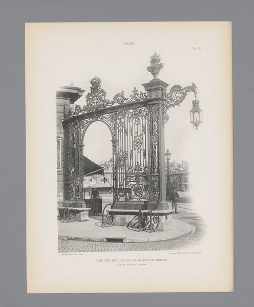 Editor: This is "Gezicht op Porte Stanislas te Nancy," dating from before 1896. It appears to be a print, perhaps made from a photograph. The imposing structure of the gate contrasts intriguingly with the everyday street scene. What do you see in this piece? Curator: I am drawn to the meticulous construction of space within the image. Note how the architectural elements — the arch itself, the flanking buildings — create a layered composition. The play of light and shadow defines form and volume. It invites us to examine the structure independently of what the structure is meant to be in our everyday life. Editor: I see that now. It's almost like the photograph is abstracting the architecture. The texture is amazing too; so precise! Is that part of Neoclassicism? Curator: Indeed. Neoclassicism frequently employs precise execution. But also consider the formal relationships; the tension between the static, monumental arch, versus the suggestion of depth created by receding planes of buildings and roadways. How does this interplay shape your reading of the image? Editor: I didn't catch that tension at first, but now I see how the photo creates a feeling of almost frozen grandeur. I was focused on what it depicts, not *how* it depicts it! Curator: Precisely! It's in observing that dialogue of forms where meaning truly arises. The photograph prompts us to examine not just what we see but how the composition shapes our perspective of the subject. Editor: So, paying attention to the forms helps us understand how we're supposed to *feel* about it? Curator: Precisely! Formal analysis provides tools with which to explore such affects, yes. Editor: Thank you, this was enlightening! Looking beyond the obvious representation certainly opened my eyes to how photographs—even older ones—are built, designed with real intention, to produce complex meaning. Curator: An eye trained on formal aspects illuminates so much! This photo of the Porte Stanislas in Nancy serves as a striking lesson, thank you for bringing this to our attention!