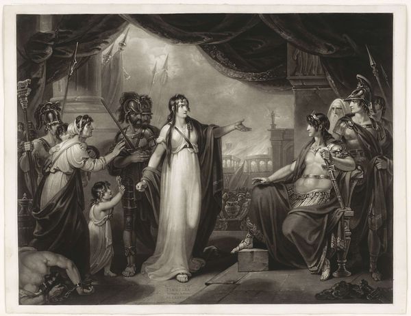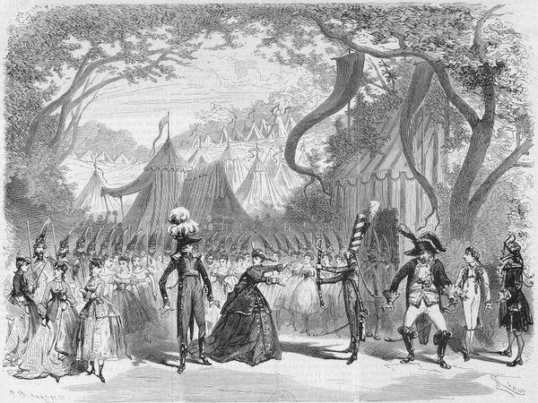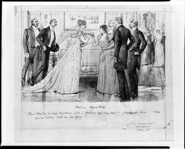 Curator: Constantin Guys's ink wash drawing, "Napoleon III Showing his Baby Son Louis to the 'Dames de la Halle'," captures a moment of political performance. Editor: It’s strikingly theatrical. The stark monochromatic palette focuses attention on gesture and form, emphasizing the staged nature of the scene. Curator: Indeed. These market women, the "Dames de la Halle," were carefully cultivated as symbols of popular support for Napoleon III's regime. Editor: The composition itself is revealing. The emperor is positioned centrally, literally presenting his heir, while the women seem almost like a chorus, their expressions a blend of curiosity and expectation. Curator: Precisely. It’s a study in the construction of dynastic power through carefully managed public image and appeal to the common people. Editor: The wash technique, so fluid and immediate, belies the calculated nature of the event itself. Even the seemingly spontaneous brushstrokes serve a propagandistic purpose. Curator: Ultimately, Guys’ drawing offers a glimpse into the strategies employed to legitimize imperial rule in 19th-century France. Editor: A fascinating glimpse, highlighting how even seemingly informal sketches can reveal complex social and political dynamics.