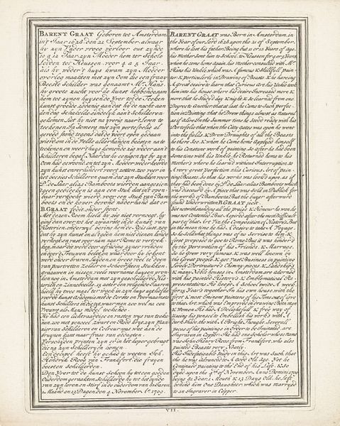 Curator: What a fascinating artifact! This is the "Programma van de begrafenis van Wilhelmina prinses-douairière van Oranje-Nassau, 1820" printed sometime between 1820 and 1826 by J. Du Mée. It outlines the order of service for Princess Wilhelmina's funeral. Editor: It has such a formal yet fragile feel. The aged paper and dense typography create a somber mood, like glimpsing a private moment from a distant era. The bordering reminds me of ancient Greek motifs...a very orderly pattern! Curator: Yes, the typography itself conveys a sense of authority and tradition, typical of printed announcements during that era. These broadsides served an important public function, informing citizens of significant state events and solidifying royal presence. Note also the decorative border that signifies status, not only communicating practical information, but performing royal propaganda in the face of political challenge. Editor: Look at the phrase "Oranje-Nassau", one of the great royal houses. "Oranje" – the orange! Such a loaded word in their heritage. Its a symbol of power and resilience, even resistance; yet here it announces solemn loss. This document shows the transformation of potent visual and verbal cues from expressions of triumph to conveying royal mourning. Curator: Precisely! The arrangement into numbered sections also reinforces order and control during a time of national grief. The distribution of the prints to the people was a display of authority. Editor: What about the repetition of "de Lijk"? I am sure that it resonates in ways we struggle to grasp now; its deliberate visual placement is almost spellbinding! Curator: It's all very performative isn't it? It's easy to read this piece only for its face value but there's political and cultural significance to be parsed beyond its main purpose as simply informing people of funerary procedures. Editor: Absolutely. When we step back and consider the many cultural threads interwoven here, this seemingly simple program offers a poignant and revealing look into both a royal death and public spectacle of loss.