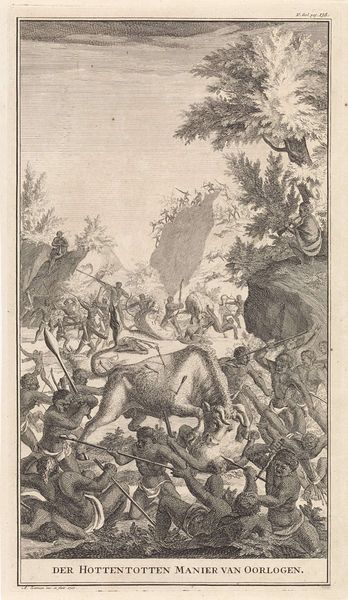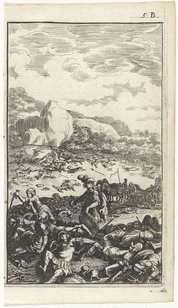 Editor: Here we have Cornelis van Dalen II’s engraving, “Neptunus in triomfwagen kalmeert zee tijdens Trojaanse oorlog,” which translates to Neptune in a Chariot Calming the Sea During the Trojan War. It was created sometime between 1648 and 1664. The scale of everything—the god, the horses, the battles—makes it feel overwhelmingly epic, but what grabs my eye is Juno on that cloud in the top portion. What are your impressions of the overall composition? Curator: Oh, Juno! Perched there with her peacocks, a veritable storm of watchful eyes. Van Dalen has woven such a delicious tapestry of power. Neptune, muscles rippling, subduing the sea and the chaos of war itself – and above, Juno, queen of the gods, overseeing it all like a disapproving headmistress. It's that tension between divine order and human folly that sings to me. The churning sea, a mirror to the turmoil in the foreground…it speaks volumes. Do you sense how the artist directs your gaze upward, Editor, towards that watchful figure? Editor: Yes, it's impossible to miss her! And that sea is quite active and dynamic with great attention to detail. Why do you think van Dalen included Juno observing everything from above? Curator: I feel that, perhaps, van Dalen invites us to consider the layers of conflict. The Trojan War wasn't *just* a human affair. The gods meddled, picked sides, amplified the chaos. Juno's presence becomes a symbol of divine intervention, a reminder that earthly conflicts are often puppets in a larger, more capricious game. Do you think that interpretation holds water, given what you know of the period? Editor: That makes sense, especially with the amount of symbolism in Baroque art, where images tend to have several layers of meaning. Now that you point it out, Juno is basically judging everyone! I didn't even see the peacocks before! Curator: Exactly! Sometimes, these visual reminders lurk right beneath the surface. Editor: I guess I see this piece in a completely new light! Thanks!