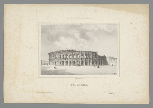 Eugène Gervais’s ‘View of the Arena of Nîmes’ is a monochrome print, meticulously rendered to capture the monument's architectural grandeur. The composition centres on the amphitheatre, its elliptical form dominating the pictorial space, creating a sense of enclosure. The strategic use of shading and line work delineates the texture of the stone and the play of light across its surface. It evokes the weight of history. Gervais’s choice to represent the arena from a slightly elevated perspective allows for a comprehensive view, emphasizing the repetitive pattern of arches and the overall symmetry of the structure. This emphasis on form and structure invites us to consider how spaces are constructed not only physically but also as cultural symbols. The arena, originally a site of public spectacle and power, is here represented as an object of aesthetic contemplation. Gervais’s focus on geometric precision and architectural detail transforms the arena into a study of volume and spatial organization. It highlights how architectural forms can become emblematic of broader social and historical narratives.
