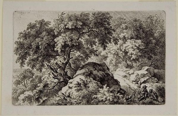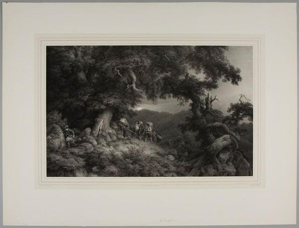 Editor: This is Wilhelm von Abbema's "Landscape with Deer and Two Screech-Owls". It's a monochromatic print of a forest scene. The density of the trees and rocks makes it feel almost claustrophobic. What do you see in this piece? Curator: I see a carefully constructed image playing on the 19th-century fascination with the sublime and the picturesque. Notice how the artist juxtaposes the tamed forest edge with a glimpse of wilder terrain in the distance, effectively creating a commentary on humankind's relationship to nature. Do you see how this imagery might reflect a specific socio-political context? Editor: I see what you mean. It’s less about pure nature and more about humanity's perspective on it. I hadn’t considered that. Curator: Exactly! And consider the role of art institutions in shaping this vision. Prints like these made landscapes accessible to a wider audience, reinforcing certain ideals about nature and national identity. Food for thought, right? Editor: Definitely. I’ll never look at landscapes the same way again.