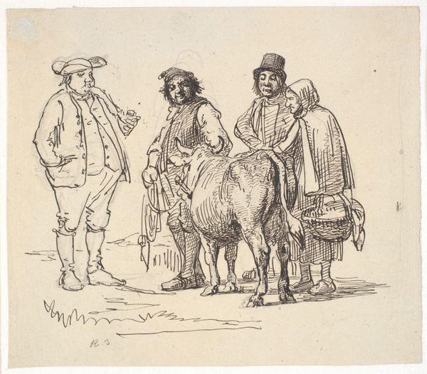 This drawing, by Abraham Teerlink, was made using pen and brown ink, and brush in brown and gray. The sepia tones define the figures – two herders, a herderess, their flock, and dogs - but what really stands out is the artist's assured handling of his chosen media. Teerlink coaxes a wide range of tonalities from the ink, achieving subtle gradations of light and shadow. The quick strokes of the pen capture the textures of the wool, the coarse cloth of the herders' garments, and the smooth skin of the herderess. The technique used here isn't just a means of depiction; it also speaks to the social context of the image. Teerlink was a master of the picturesque, of evoking a rustic, timeless scene. Yet, this image is rendered in a way that emphasizes the labor involved in pastoral life, the constant attention required to manage and maintain a flock. The drawing, therefore, transcends simple nostalgia, offering a glimpse into the realities of rural existence.