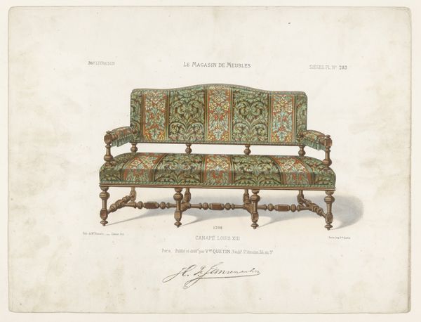 Curator: Let's turn our attention to this charming lithograph and watercolor drawing, "Canapé," dating from after 1878. It's a furniture study, signed V.L. Quetin. Editor: It looks rather uncomfortable! A very decorative, stylized sofa rendered with exquisite precision. There's something undeniably precious and delicate about it. I’m drawn to the stylized nature of the flora and the overall mood of polite leisure. Curator: Precisely! These furniture pieces, inspired by Louis XIV styles, were potent symbols. Think about what the canapé represents culturally. Beyond just seating, it signifies a specific kind of leisure, privilege, and social performance. Editor: Oh, absolutely. The very design speaks to restricted movement, almost like a gilded cage. The elaborate frame and delicate floral pattern act as social codes, defining who can access such luxury, underscoring a stratified society. How much labour went into its construction, compared to those permitted to rest upon it. Curator: And the flowers are never arbitrary. They would be carefully chosen. These botanical motifs would represent particular sentiments or virtues, like fidelity, remembrance, beauty. Their presence enhances the psychological symbolism associated with wealth. The artist, through line and colour, subtly encodes this social and psychological dimension. Editor: So, on the surface, it's a lovely piece of decorative art but also quietly conveys the values, assumptions and unspoken hierarchies of the late 19th century. Does the repetition of motifs signal stability or an ossified social order that refuses to make room for others? Curator: Perhaps it suggests both! It presents a system confident in its aesthetics, reinforcing its status. These aren't wild meadows; this is curated, tamed beauty—power, if you will, put on display in every line and hue. Editor: It definitely offers a fascinating portal. The design aesthetic seems, ultimately, like such a pointed claim. One could talk endlessly about its complex historical and social resonance! Curator: Indeed. It allows us to look deeper. This "Canapé," seemingly just a pretty drawing, holds many histories.