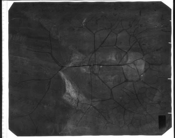 Curator: This is an X-radiograph of "Dead Christ and Angels," after Paolo Veronese. The image is part of the collection at the Harvard Art Museums. Editor: It has a stark, almost skeletal quality. The network of lines crisscrossing the surface gives the impression of vulnerability and hidden structure. Curator: Absolutely. Radiography reveals the artist’s process but also the cultural significance embedded in the subject matter: the suffering and sacrifice central to Christian ideology. Editor: The composition guides us through the image, using the lines to emphasize certain areas, creating a visual narrative. Curator: Yes, and the implied narrative is potent, resonating with the ongoing struggles against systemic oppression in marginalized communities, and reflecting themes of resilience, death, and rebirth. Editor: The way light and shadow play across the surface emphasizes the underlying geometry. It all comes together. Curator: Seeing the inner workings of this artwork adds a layer of meaning that prompts important reflections. Editor: Indeed, a fascinating glimpse into the unseen.