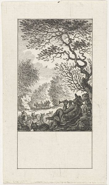 Curator: This month’s print from the Rijksmuseum, simply titled "Maart," dates from somewhere between 1722 and 1784, and is by Simon Fokke. Editor: It immediately evokes a stark and unforgiving scene. The linear precision, the stark contrasts—it almost feels like witnessing a storm brewing. Curator: The artist’s control over line is certainly striking. Notice how the density of lines varies to create tonal shifts, constructing depth within what could have been a very flat plane. The etching technique, with its precise execution, adds to this overall impression of... intentionality. Editor: I find that intention particularly powerful when I consider it in the context of maritime symbols. Water here could represent chaos or the unconscious, with that listing ship perhaps embodying a venture in danger of capsizing. And then we see those figures in the foreground struggling, hauling in nets... Curator: Their efforts bring to mind Sisyphus, forever condemned. But considered formally, the scene is beautifully structured. The strong vertical of the aged, barren tree on the right—a direct contrast to the dynamic angle of the struggling ship, creating visual tension. The eye is led from one area to the other by the mesh of fishing nets, in the lower portion of the image. Editor: Yes, those recurring net motifs draw our focus. Fishing nets often appear across cultures—they could mean that resources are strained, that you have to struggle to capture fortune from the sea. It almost echoes our need to make meaning from chaos. Curator: Or consider it as a compositional choice to use repeated forms—in this case the recurring mesh motif—to solidify the work's structure, creating a visual rhythm that unifies disparate elements. It serves as both image and structure. Editor: Whether we interpret this piece through form or narrative, its persistent imagery certainly leaves its mark. Curator: Indeed. Its clear, delineated structure supports layers of interpretation.