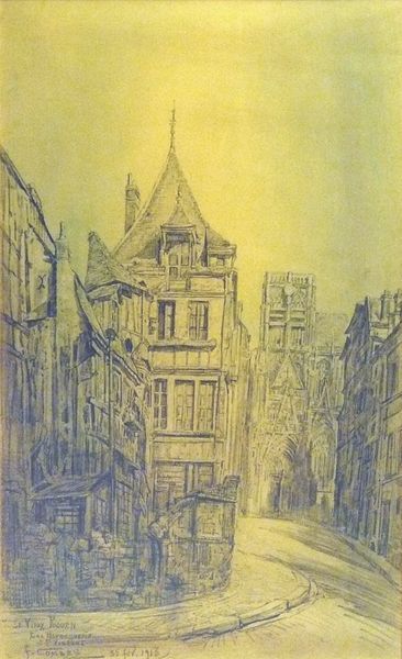 Editor: This is Fernand Combes’ “Pérouges, Rue Des Rondes, Le Grenier à Sel” from 1919, made with paint, pencil, and pen. The sepia tones give it an antiquated feel. What jumps out to you about this piece? Curator: Immediately, I’m drawn to consider how Combes captures the specific textures and forms of a medieval village during a period of immense social upheaval following the first World War. Think about the yearning for a simpler, pre-industrial past, a longing to reclaim what was lost. Do you see how the use of varied media-- pencil, pen, and paint-- might speak to these tensions? Editor: Yes, the rough pencil strokes create a sense of unease, contrasting with the smoother paint textures. How does that reflect social upheaval? Curator: Post-war, there's a huge identity crisis. Some looked back to rebuild, and some, of whom Combes might be, tried to build anew from a forgotten past. Look closely at how the architectural detail becomes almost exaggerated. Could it represent a yearning for permanence and stability in the face of widespread change? The drawing romanticizes what once was while critiquing what had become. Editor: So it's less a literal depiction and more a commentary on the artist's perception of that time? Curator: Precisely. Consider, too, the political dimensions: was this a conscious effort to preserve memory and perhaps even resist the forces of modernization that threatened to erase the past? Art like this serves as a kind of quiet activism. What does this evoke in you, knowing more of its cultural milieu? Editor: Knowing that, I feel like it speaks to resilience, the kind you find in marginalized communities clinging to their heritage. Curator: Indeed, a powerful reflection on the negotiation between heritage and modernity. Editor: I’ll definitely look at art from that period with fresh eyes now. Curator: Me too!