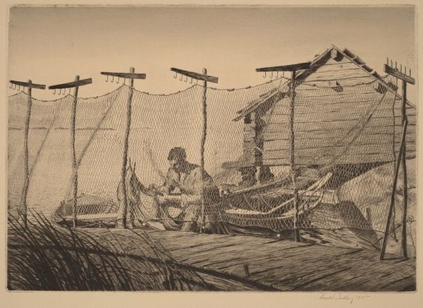 Curator: The first thing that strikes me is the darkness, a cloistered almost sacred feeling inside the building compared to the brightly lit space outside. Editor: That's exactly what Corot captures in this oil painting, "Entrance to a Chalet in the Bernese Oberland," created in 1842. The artist is playing with contrasts of light and shadow in a way that feels so carefully considered, a cornerstone of Romanticism. Curator: The figures gathered inside have an iconic presence; their poses feel rooted in tradition. I can see the maternal, life-giving symbol echoed by the woman with the child and also reflected in the natural, vibrant light spilling from the doorway. Editor: You've honed in on what makes this work so enduring. It isn't simply a landscape but a vignette of daily life elevated through painterly skill. Look at the other figures – perhaps travelers pausing to interact. Their inclusion turns this landscape into a glimpse of 19th-century social dynamics, too. The romantic impulse of portraying ideal lives. Curator: The wood logs lying about indicate honest labor; Corot has elevated an idealized agrarian lifestyle here. And yes, that's such an astute observation regarding the travelers; they really act as witnesses between different parts of society. I am not quite certain I read the "idyllic" image; it has a somber side, almost. Editor: I appreciate your interpretation; there's indeed a stillness about the painting. Maybe it comes down to the colors Corot has used—earths, browns, dark shades contrasting that vibrant slice of light, to really draw our focus towards figures interacting around the chalet, and making sure we note the socio-cultural and economic context of this intimate rural scene. It’s a balancing act. Curator: Thank you for sharing all this. It reinforces my sense that beyond simply capturing a pretty landscape, Corot delivers a glimpse into our collective unconscious. The play between the shelter and wild beckons fundamental notions. Editor: Absolutely! A cultural artifact presented by one of the master landscape artists of the 19th century.
