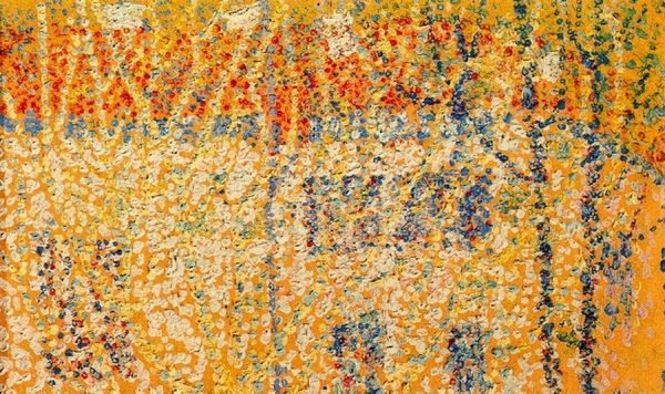 Curator: This is Christian Rohlfs’s “Kornpuppen im Kornfeld,” painted in 1907 using oil paints. What stands out to you most about this piece? Editor: It’s the texture, definitely the texture! It’s almost aggressively tactile. It looks like it’s made of countless little marks, almost like each brushstroke is fighting to be seen. I wonder, how does this treatment of the material contribute to the overall impact? Curator: Excellent observation. Think about the conditions of its production. The heavy impasto—the thick application of the oil paint itself—that isn't merely descriptive. It becomes performative. Consider the availability of paint at this time. Pigments were becoming increasingly industrialized, more readily available. Does this abundance play a role, do you think, in the expressive handling we see here? Editor: So, the industrial production of paint allows for this very visible display of labour and material? I hadn’t thought about it that way. I initially thought that was only related to landscape art... Curator: Precisely. We see a parallel between the mechanized processes providing the *means* for production – that is, the materials themselves, and the very visible act of *making* represented on the canvas. What does that visibility tell us, especially in 1907, a period defined by increasingly alienated labor in urban, industrial contexts? Editor: So, maybe Rohlfs is celebrating the labour of painting, of craft? He's not hiding the process; he’s flaunting it, almost celebrating the materiality itself. Curator: Exactly. Now consider what the landscape imagery itself. Can you tell what specific kind of wheat? What region do you think it came from? Is it presented as raw material ready to become industrial feedstocks or commodity? Or is Rohlfs using this field of wheat for expressive impact in brush strokes. Editor: This has changed how I’m going to approach artworks. It's more than just what the painting shows, but what the making reveals!