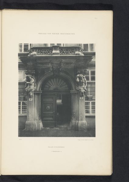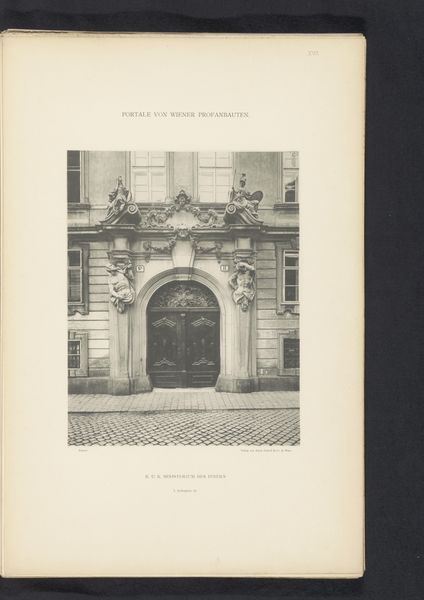 Editor: Here we have a photographic print of the "Toegangsportaal van het Erzbischöfliches Curhaus te Wenen," or the entrance portal of the Archbishop's Curhaus in Vienna, dated before 1894. The image itself feels quite formal, even imposing, with its architectural details. How do you approach a work like this? Curator: Looking at this image, I immediately think about the labor involved in its creation and reception. Consider the quarrying, transport, and carving of the stone, the carpentry involved in crafting the door itself. Then there’s the photographic process – the labor of the photographer, the printer, the very consumption of resources to produce an image of a doorway. This building represents considerable capital. What does that suggest to you? Editor: Well, seeing it from that point of view, I suppose it really highlights the hierarchical structure of society at the time. All those resources devoted to creating such an elaborate entrance clearly demonstrate power and status. Curator: Precisely. And notice how the print flattens the textures and depth. Does that impact your perception of the materials? How does the translation into a reproducible image alter the experience? Editor: It does! I lose some of that tactile sense, the feel of the stone and wood. It makes me think about how photography, as a medium, democratized art to some extent, but also commodified it in new ways. Curator: Indeed. The photograph becomes an object of consumption itself, detaching the viewer further from the original craftsmanship, yet simultaneously spreading its influence. It invites questions about accessibility and the control of representation. Editor: This has definitely changed my perspective. I went in thinking only about architecture, but now I'm thinking about labour, class, and even the social implications of image-making itself. Curator: Exactly, and understanding these layers can vastly deepen our appreciation for the cultural narratives embedded within seemingly simple images.