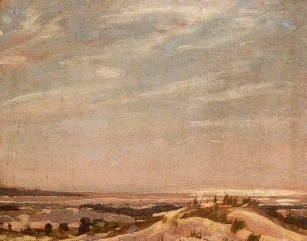 Curator: Immediately striking. There's a serene clarity to the composition, a structured approach even in this seemingly pastoral scene. The color palette, while muted, provides a great interplay between light and shadow. Editor: We're looking at "Trinita dei Monti from the Villa Medici," painted in 1834 by Camille Corot. It’s an oil on canvas, demonstrating his engagement with plein-air painting during his time in Italy. Curator: Yes, the atmospheric perspective creates depth. Note the geometry of the buildings—cubes, cylinders—and how they’re softened by Corot’s loose brushwork. He builds form with light. Editor: Absolutely, and it’s essential to view this piece within the context of Corot's artistic development. This view, rendered from the Villa Medici, offered a prestigious vantage point from which to depict Rome. Consider that plein-air wasn't just about capturing the 'scene'—it was tied to notions of authenticity, and of experiencing art within broader sociopolitical debates. Curator: His commitment to capturing visual sensations gives this work authenticity. It is clear in the gradations in light; his willingness to present that and almost abandon clarity provides us an insightful way to explore visual structures of pictorial language. Editor: It reflects the period's growing interest in unadulterated artistic observation, especially regarding Romanticism. These Roman views served not just as exercises for the artist but also as visual documentation for the increasingly popular tourist market. The light in this particular view reflects how Corot, even at an early stage, sought an approach that favored subtle observations over grandiose aesthetics. Curator: True. We also appreciate the horizontal orientation, lending itself towards spatial explorations by structuring various forms in terms of scale. Corot is using a formal vocabulary to explore this vista. Editor: His gaze, so perfectly embodied in this cityscape, presents us with not just what Rome looked like but the experiences and political and cultural climate of the moment as he experienced it. Curator: The painting provides an intriguing analysis of what happens when a structured style interprets an unencumbered reality. It serves to enrich our perception. Editor: Ultimately, Corot offers us a glimpse into 19th-century Rome—as seen by an artist grappling with new ways to observe and interpret the world.