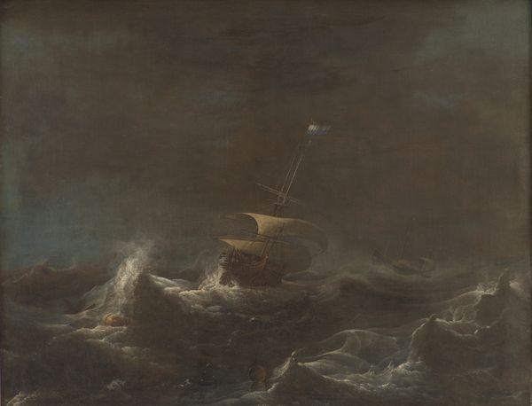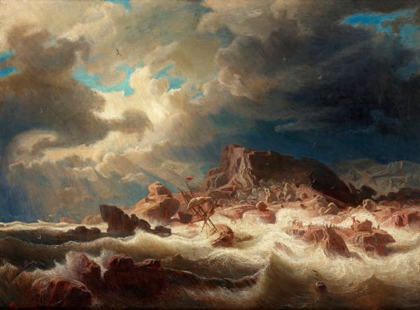 Jules Dupré captured this tempestuous scene using oil on canvas. The artwork's composition plunges us into a maelstrom of churning waves and ominous skies, dominated by a palette of stormy grays, greens, and browns that evoke a sense of foreboding. The artist's brushstrokes are visibly textured, mirroring the chaotic energy of the storm. The two boats, rendered with thick, impasto strokes, appear as vulnerable forms against the overwhelming force of nature. This painting speaks to the Romantic era's fascination with the sublime—the awe-inspiring power of nature that dwarfs human endeavor. Dupre's approach can be seen as a reflection of broader artistic and philosophical concerns. It also challenges fixed meanings, as the artwork is not just a depiction of a storm but a symbol of life's unpredictable nature. It invites us to contemplate our place within the vast, indifferent cosmos. This piece functions as a commentary on the dynamic interplay between humanity and nature.
