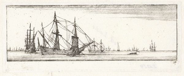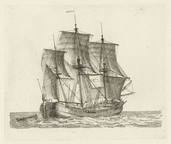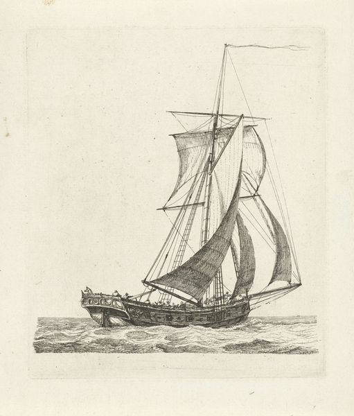 Gerrit Groenewegen created this print of a 'Tweemaster met twee figuren' – a two-masted ship with two figures – using etching. This artwork provides a glimpse into the maritime culture of the Netherlands, a nation with a storied history deeply intertwined with the sea. During Groenewegen's time, the late 18th and early 19th centuries, the Dutch Republic and later the Kingdom of the Netherlands relied heavily on maritime trade and naval power. The ship depicted here was more than just a vessel, it was a vital link in global trade networks. The detailed rendering and precise linework suggest the importance of accuracy in maritime documentation, and the image hints at the social structure of the time, where seafaring was a common occupation. To fully understand this etching, we can look to shipping records, trade statistics, and social histories of Dutch maritime communities. This print, like all art, is a product of its time, shaped by economic, social, and institutional forces.