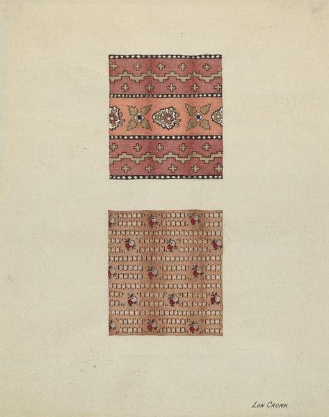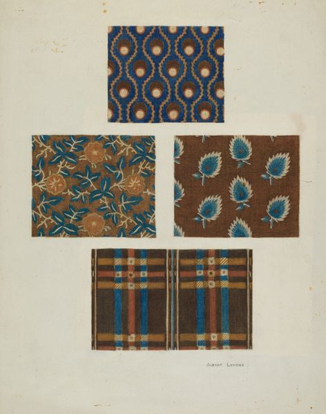 Editor: So, this mixed-media work is called "Cotton Prints," and it's attributed to Albert Levone from around 1937. The drawing shows four different textile patterns in blues, greens, and browns. I find it really appealing, like something that could be on a dress or furnishing from that era, even a contemporary runway look, it evokes luxury and class. How do you interpret this work, given its medium and style? Curator: Well, considering Levone's "Cotton Prints," dating back to the late 1930s, it’s essential to understand its place within the broader socio-economic context. Think about the cultural landscape during the Depression Era, where textiles held significant meaning beyond mere decoration. The designs, with their geometric and abstract forms characteristic of Art Deco and Modernism, become almost subversive acts. Editor: Subversive, how so? Curator: Well, the patterns themselves suggest a desire for progress and modernity at a time when many were struggling with economic hardship. The textile designs become a form of resistance, almost projecting a vision of a brighter future through aesthetics. These designs likely targeted a growing market of working women entering professional spaces. How can fashion and textile design contribute to conversations around labour and access? Editor: I never really considered how social context would have impacted textile designs; it’s fascinating to view fashion as a subtle rebellion or advocacy for social progress. I hadn't looked at it beyond face value and assumed decorative art's function as mostly for beauty. Curator: Precisely! That's why exploring art and its origins in conversation, looking through a lens of historical understanding is critical, isn't it?